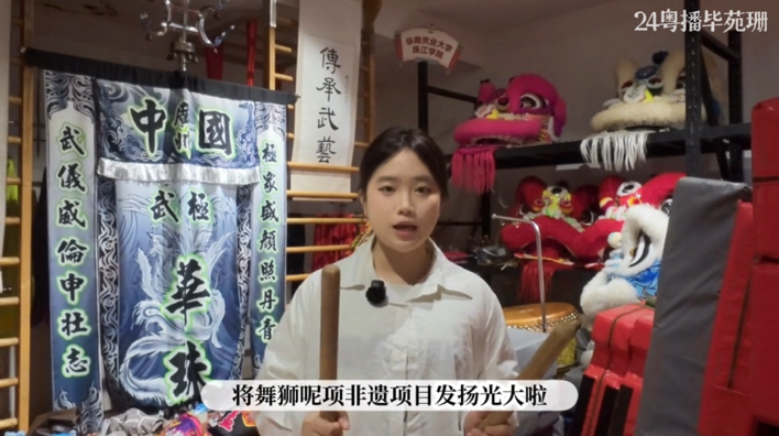 《大学醒狮队》的作者毕苑珊在参与该作品创作的过程中,深切感受到传统文化与创意表达碰撞的魅力。为呈现学校醒狮队的风采,她多次跟随队员训练,用镜头记录腾跃、击鼓的瞬间,深入了解他们的坚持;同时查阅大量岭南醒狮资料,结合学校特色撰写讲稿。通过一次次修改讲稿、模拟演练,她不仅加深了对醒狮文化的理解,更学会用青年视角诠释非遗传承的意义。这段创作也让她明白,传承文化需要创新表达,而这段经历也成为她探索传统文化传播的新起点。