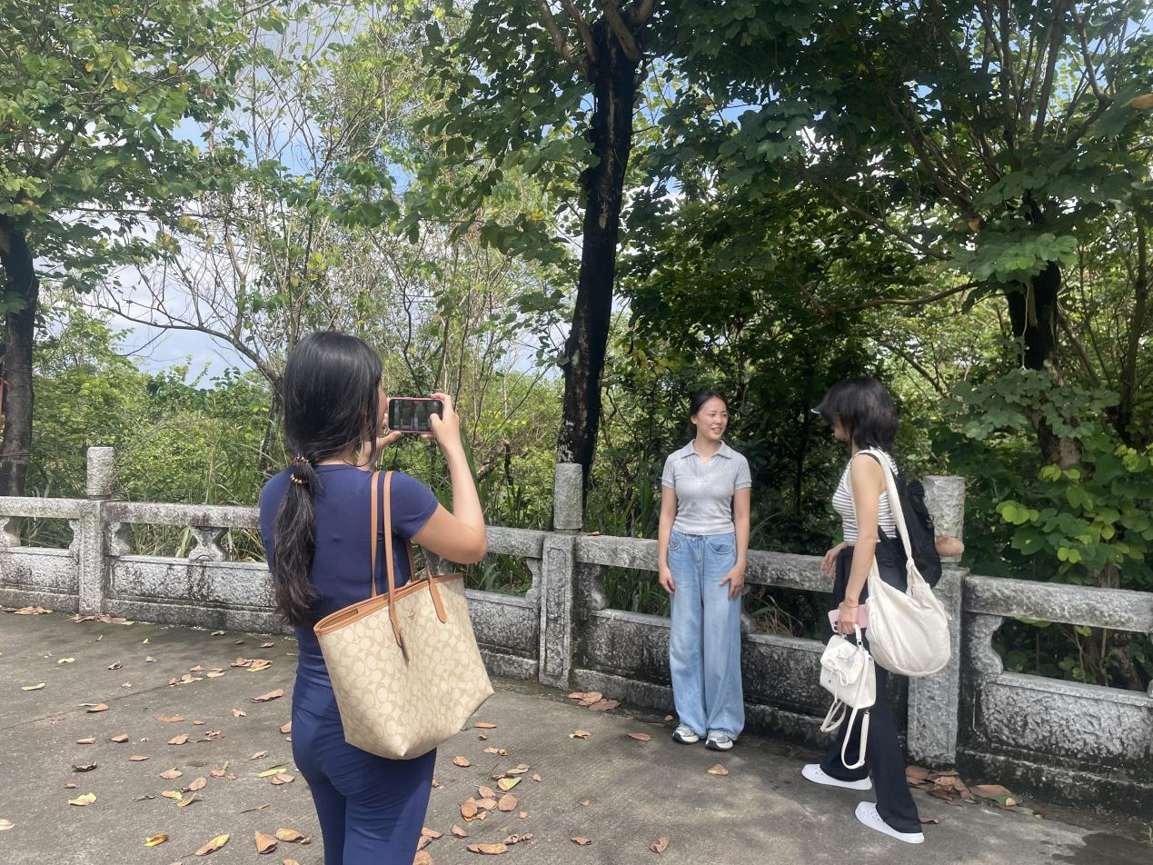 实训首日,师生队伍奔赴广州市从化区风云岭森林公园。作为从化区标志性生态地标,这里不仅拥有黎塘河、小海河、流溪河三水交汇的灵动景致,更以松树林、针阔交林及荔枝林构建起层次丰富的植被景观,文峰塔的古朴、何仙姑庙的雅致等人文遗迹点缀其间,形成 “自然 + 人文” 的独特实训场景。学生们以公园为实景演播厅,沉浸式投入文旅节目策划与制作,将秀丽自然风光与深厚人文底蕴融入播音主持实践,在镜头前用生动语言讲述风云岭的生态故事与文化传说,迈出专业实践的坚实第一步。