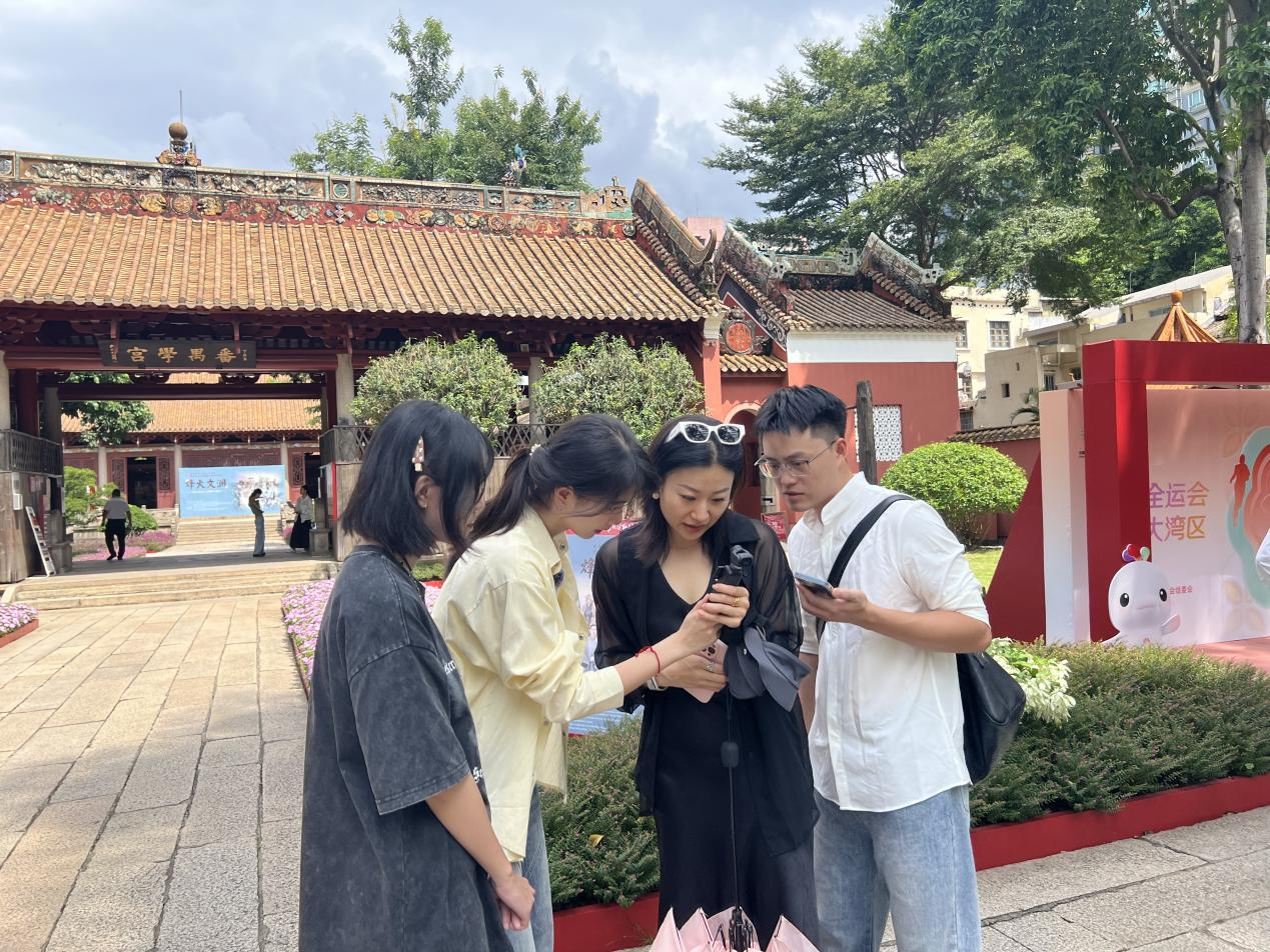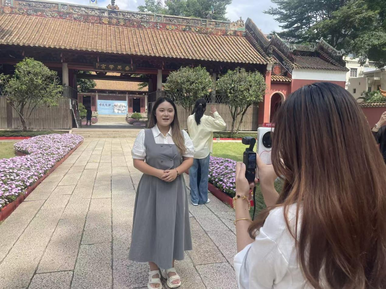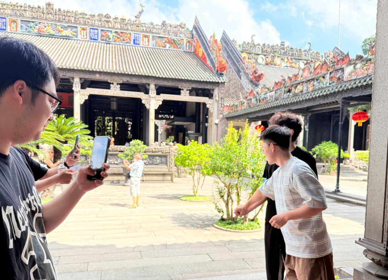 实训期间,师生们走进陈家祠与永庆坊,开启 “传统文化与湾区活力” 的探索之旅。在陈家祠 —— 这座被誉为 “岭南建筑艺术明珠” 的古建筑群中,学生们穿梭于雕梁画栋间,细致观察砖雕、木雕、灰塑等岭南传统工艺,以播音主持形式录制 “古建筑文化解读” 系列短片,用声音传递岭南建筑的匠心与美学。步入永庆坊,老骑楼的复古韵味与现代文创的潮流气息交相辉映,学生们围绕 “湾区故事” 主题,走访非遗工作室、特色商铺,采访居民与创业者,挖掘城市更新中 “老城市新活力” 的鲜活案例,在实践中探索如何用年轻化语言讲述湾区发展故事。