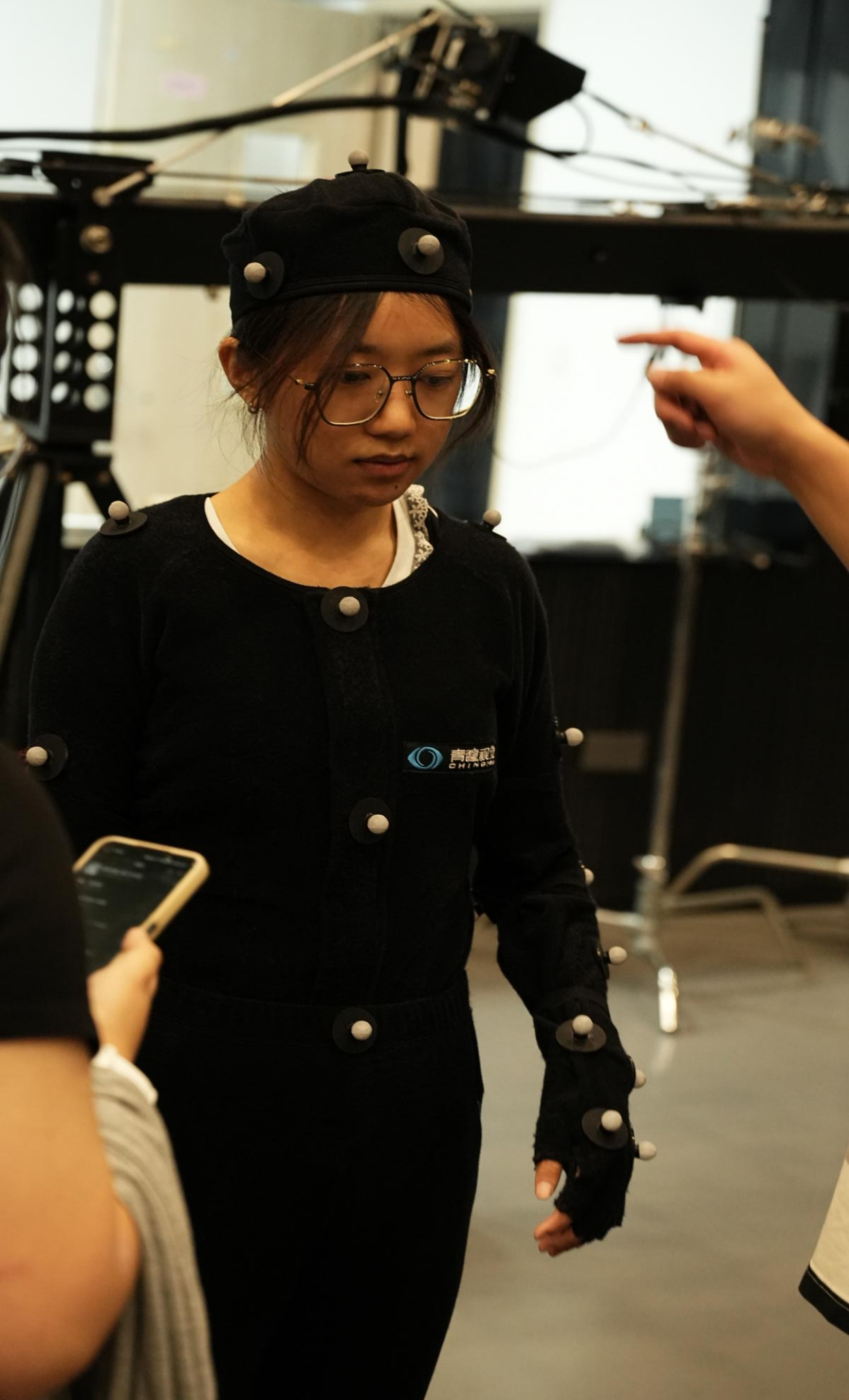 在技术团队的指导下,各小组首先学习青瞳MC系列动捕相机的搭建方法:根据实验室空间尺寸调整相机角度,确保相机可覆盖整个动作采集区域;通过软件完成相机标定,实现定位精准。随后,学生轮流佩戴标记点套装,在专业人员协助下完成“标记点位置校准”“人体骨骼模型匹配”等准备工作,亲身感受如何实现“动作即捕捉”的实时效果。
